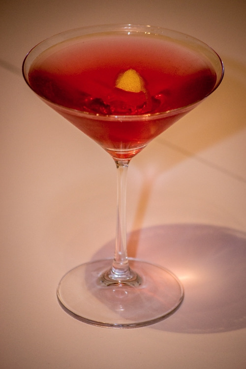 - Passez (en filtrant les glaçons à l'aide la passoire) dans un verre à martini rafraichi