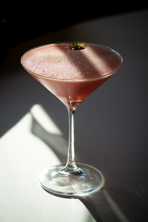 5. Passez (en filtrant les glaçons) dans un verre à cocktail rempli au 3/4 de glace pilée