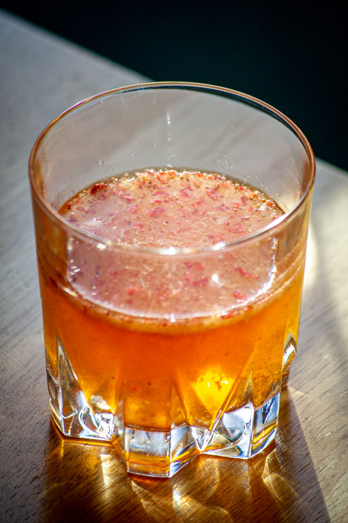 2 Passer : verser en filtrant à l'aide de la passoir a cocktail, les glaçons et la pulpe