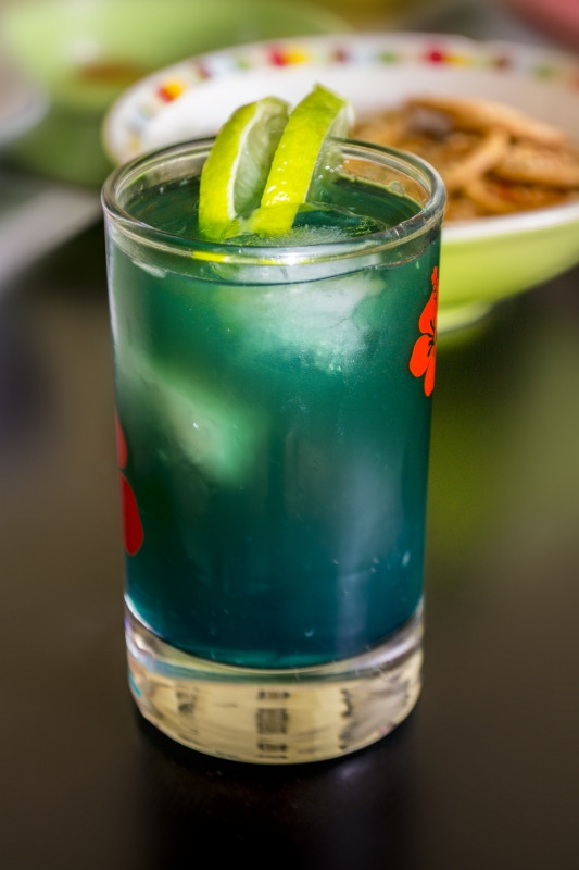 - Verser le sirop de sucre de canne, le curaçao, le rhum et le jus du citron vert et frappez